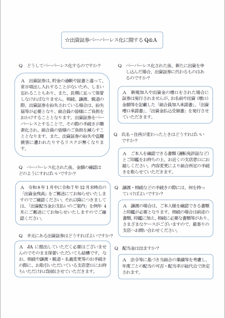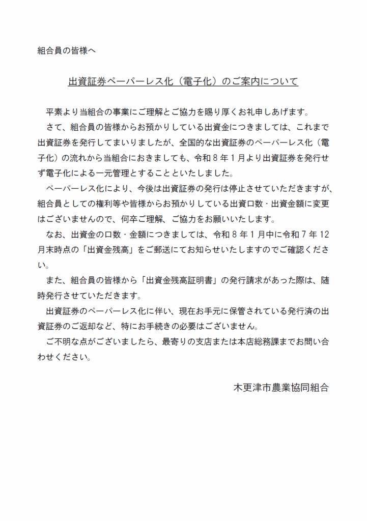 出資証券ペーパーレス化(電子化)のご案内について