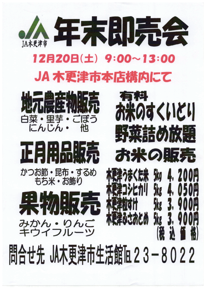年末即売会のお知らせ!12月20日(土)9:00~13:00                    JA木更津市本店構内にて