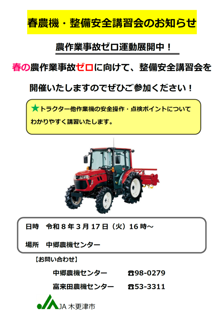 春の農機・整備安全講習会のお知らせ! 日時:3月17日(火) 場所: 中郷農機センター 16:00~